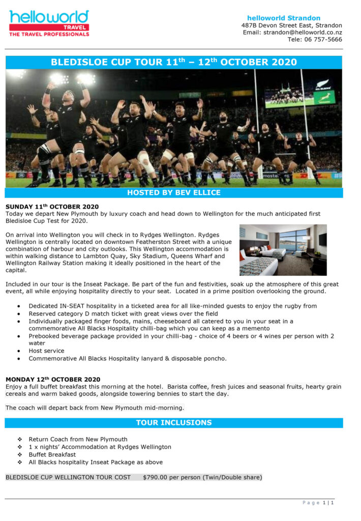 helloworld Strandon has put together a 2-day In-seat Package for the first Bledisloe Cup in Wellington. This test is sure to be a sort after so if you are interested please call Bev Ellice on 06 757-5666 to secure your booking.